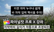 [파이널컷X] 자동 바 길이 조정 자막 템플릿 공유 파이널컷 강좌 목록 파이널컷X 10.3 강좌 목록 정리 영상 편집 준비(설치 및 세팅) 프로젝트 설정 알아보기 가로영상 세로영상 제작방법 자막에 사용할 한글폰트설치 한글 입력 상태에서 단축키를 사용하는 방법 영상 편집 특정 부분 확대해서 보여주기 영상 거꾸로 재생되도록 편집하기 프로젝트 크기에 영상 크기 맞추기 영상 확대 축소 마음대로 주무르기 (매드무비제작 스킬) 프록시 파일 편집으로 가볍게 하기 영상크기 조절 및 흑백효과주기 서서히 원하는 색으로 물들이기 보정 흔들린영상 보정하기 (손떨방) 오디오 관련 기능 오디오 볼륨 최대치 이상 키우기 자막 관련 기능 [파이널컷X] 타이핑 자막 만들기 고급 편집 기법 배경에 텍스트 넣기 (크로마키) 멀티캠 편집 방법 영상 편집 응용 프리미어의 타임라인 처럼 편집하.. -